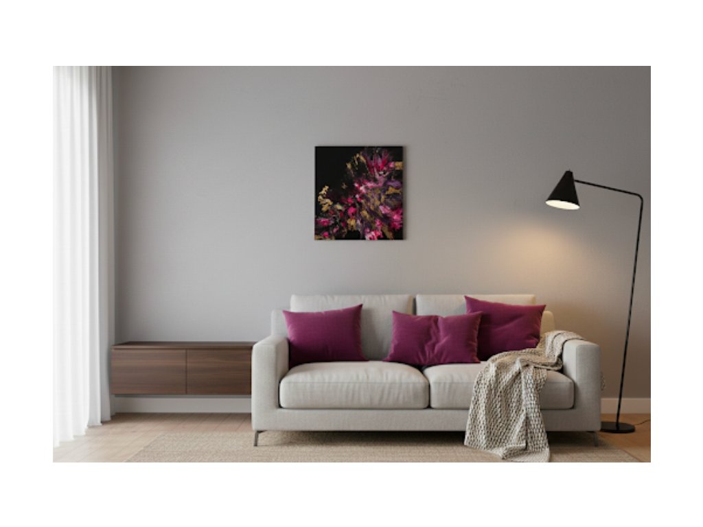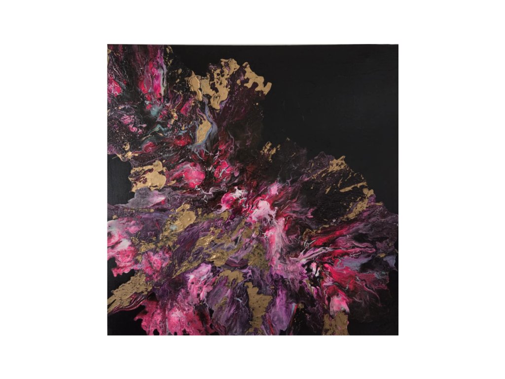 Tento autorský kousek je dokonalou fúzí dramatické černé a explozivních odstínů magenty, doplněných o jemné zlaté odlesky.